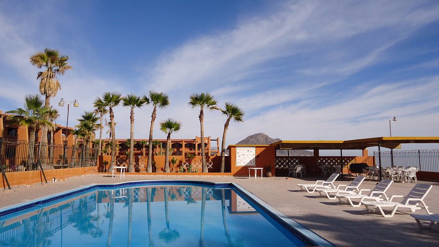 Facilities include two swimming pools—one for children—a sports area, barbecue spaces, and a palm-covered outdoor lounge. Guests can also use the hotel’s campground or RV park. The on-site restaurant serves Mexican and international dishes, and the adjoining bar is known as a local gathering place for cocktails and social events.